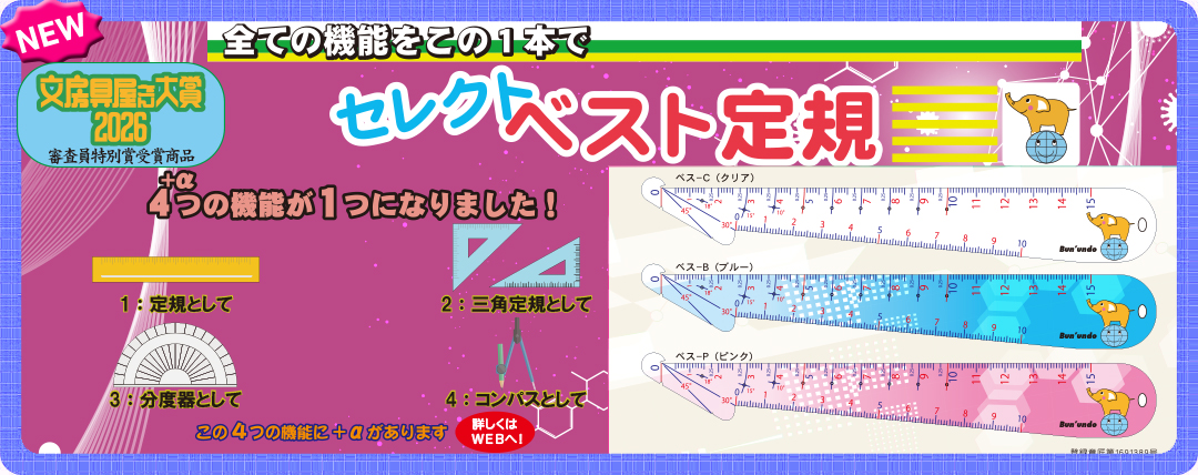 セレクトベスト定規新発売お知らせ。(プレスリリースはこちら) 株式会社UHOLABOと共同開発した多機能定規 「セレクトベスト定規」 を、2026年3月27日より発売しました。 本商品は 文房具屋さん大賞2026「審査員特別賞」 を受賞。 ドットポッチノート とあわせて、ノートづくりをサポートする文具として提案します。 |